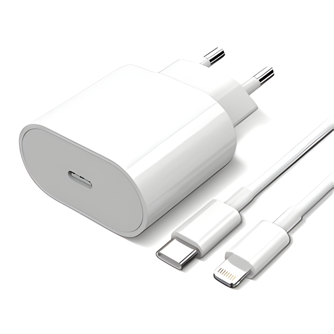 Cargador rápido de 20W certificado con puerto USB-C, ideal para cargar tu dispositivo en menos tiempo y con total seguridad. Compatible con iPhone, Android y más.